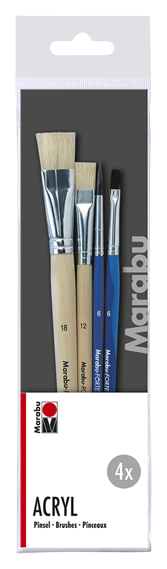 Marabu Acryl je súprava 4 štetcov Marabu Robust plochý, veľkosť 12, 18, Marabu Forte plochý, veľkosť 6 a Marabu Forte guľatý, veľkosť 6. Je ideálna pre maľovanie akrylovými ako aj olejovými farbami.