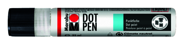 DOT PEN je bodová farba na vodnej báze, ktorá zasychá,s matným povrchom.Farba automaticky vytvára vyvýšenébodky, ktorých veľkosť sa dá ľahko ovplyvniť množstvom nanesenej farby.Farba DOT PEN je vegánska a vhodná pre mnoho svetlýcha tmavých povrchov napr. papier, drevo, kameň, sklo, porcelána textílie (až 20 % obsahu syntetických vlákien, nechajte 72 hod.schnúť, perte na jemnú bielizeň na 30 ° C ).Farby je možné miešať medzisebou a nie je nutná fixácia ani na textile.