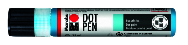 DOT PEN je bodová farba na vodnej báze, ktorá zasychá,s matným povrchom.Farba automaticky vytvára vyvýšenébodky, ktorých veľkosť sa dá ľahko ovplyvniť množstvom nanesenej farby.Farba DOT PEN je vegánska a vhodná pre mnoho svetlýcha tmavých povrchov napr. papier, drevo, kameň, sklo, porcelána textílie (až 20 % obsahu syntetických vlákien, nechajte 72 hod.schnúť, perte na jemnú bielizeň na 30 ° C ).Farby je možné miešať medzisebou a nie je nutná fixácia ani na textile.