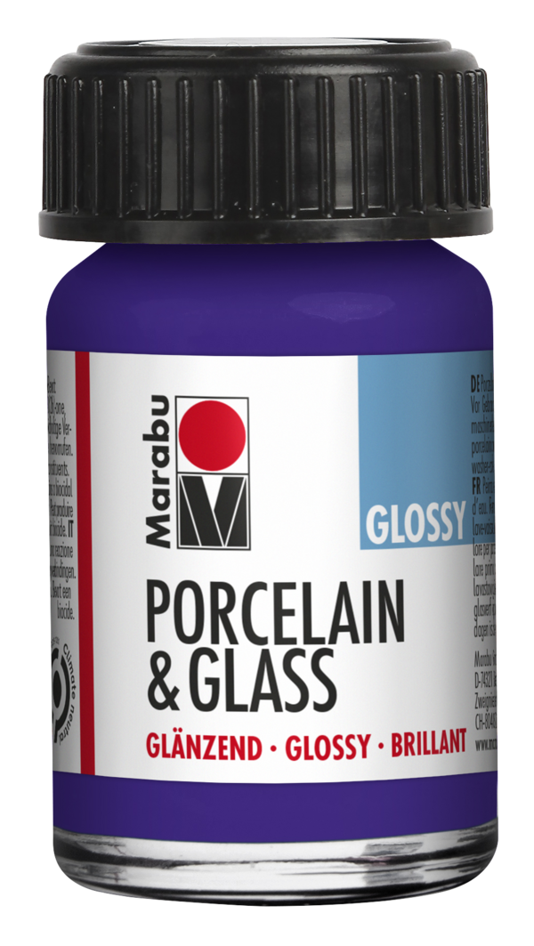 Porcelain & Glas - lesklá transparentná farba na vodnej báze.Na maľovanie na sklo, porcelán, keramiku a akrylové sklo atď. Nie je nutné vypaľovanie: farba zaschne po troch dňoch, potom je možné umývať v umývačke pri teplote max. 50 °C.Povrch musí byť zbavený mastnoty.Farbu dobre premiešajte.V kombinácii s Porcelain & Glas Painter je možné farbu bez problémov vypáliť 30 min.pri 160 °C.